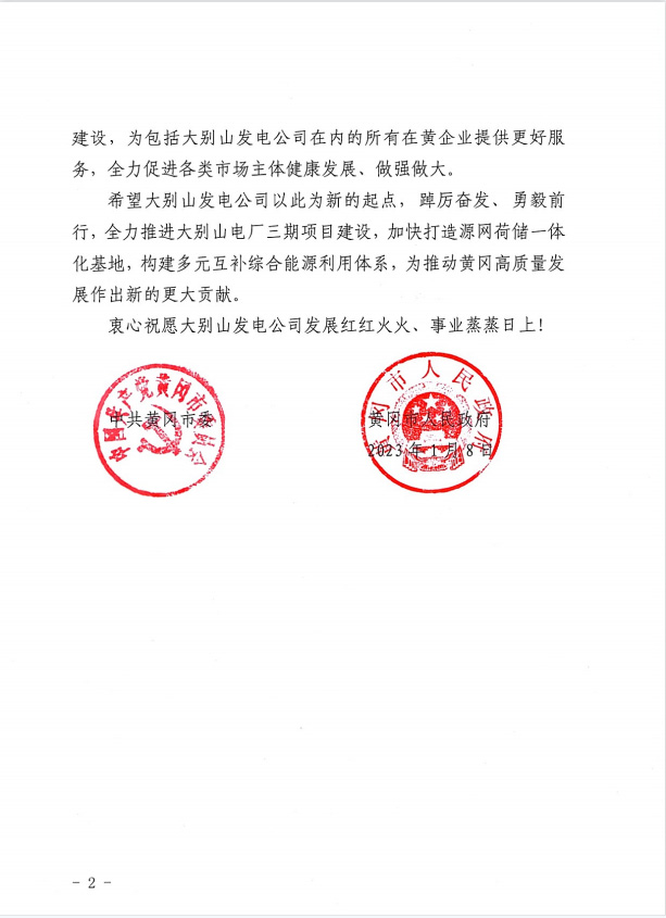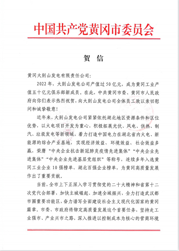 黃岡大別山發(fā)電有限責(zé)任公司總經(jīng)理汪紅旭收到賀信后深情地說(shuō):“我們深刻感受到黃岡市委、市政府對(duì)我們企業(yè)的大力支持,也深刻感受到黃岡市委、市政府重視發(fā)展工業(yè)的決心,我們將以火電項(xiàng)目開發(fā)為重心,積極拓展光伏、風(fēng)電、供熱、制汽、垃圾發(fā)電等新能源領(lǐng)域,著力打造中國(guó)電力在湖北省內(nèi)火電、新能源的綜合產(chǎn)業(yè)基地。”